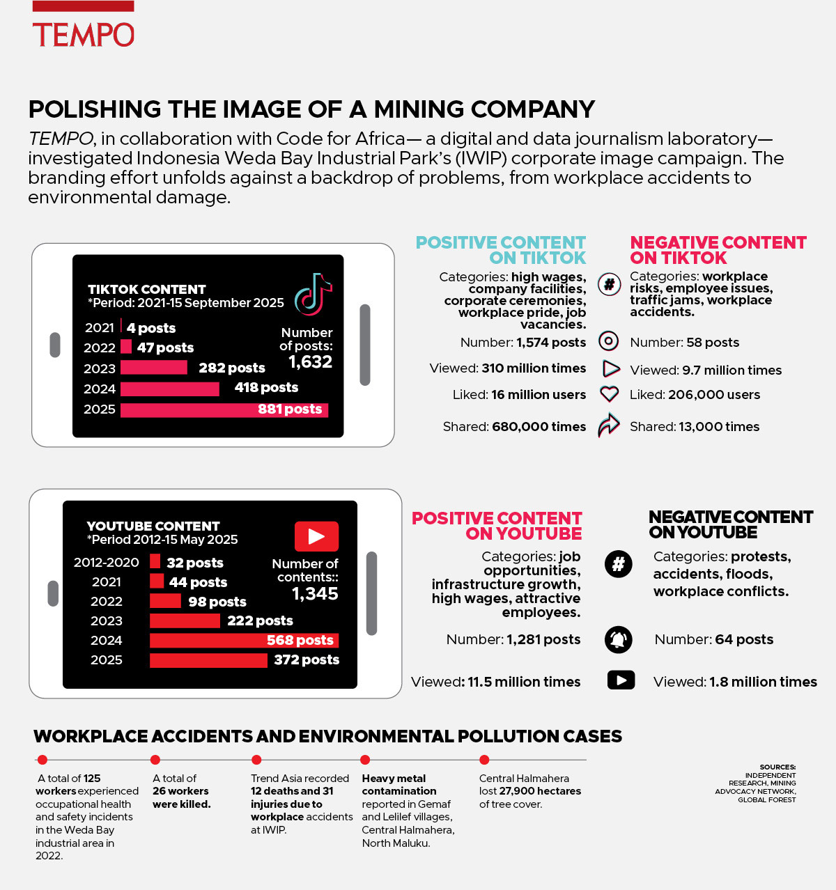 To track IWIP’s online campaign, Tempo filtered posts through hashtags including #iwip, #iwiphits, #iwip_wedabay, #iwiphalteng, #iwiphelmkuning, and #wedabaynikel. On TikTok, 1,632 posts were analyzed. Output about IWIP on the China-based platform surged in three years, from 47 in 2022 to 881 in 2025. Ninety-six percent of the posts highlighted the benefits of working in nickel mines, such as high wages and equal opportunities for women. The rest touched on the impacts of mining, including work accidents and employment issues.