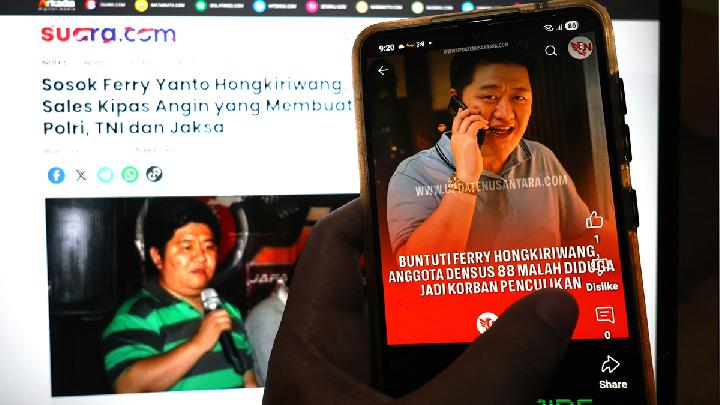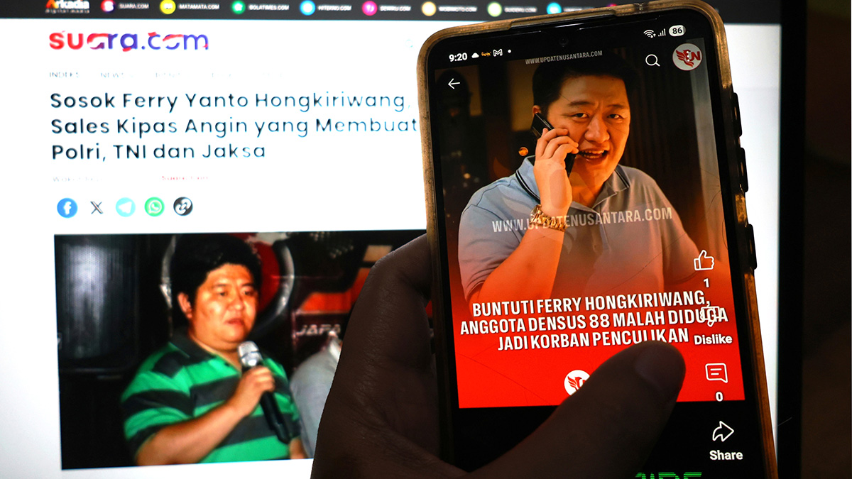 Police arrested Ferry Hongkiriwang, accused of abducting a Densus 88 personnel. He is closely connected to top brass in the military and the Attorney General’s Office.